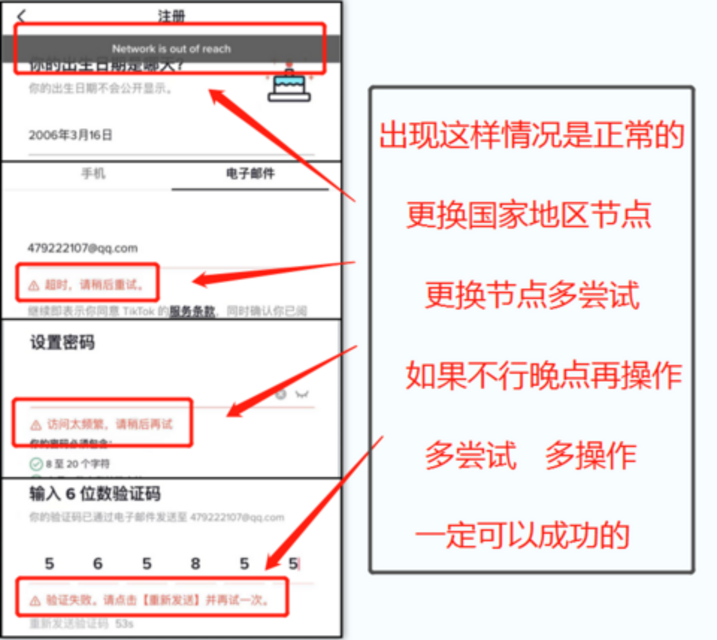 如果仍然显示登录错误,退出Tiktok,使用付费节点注册,成功注册几率达到98%!!